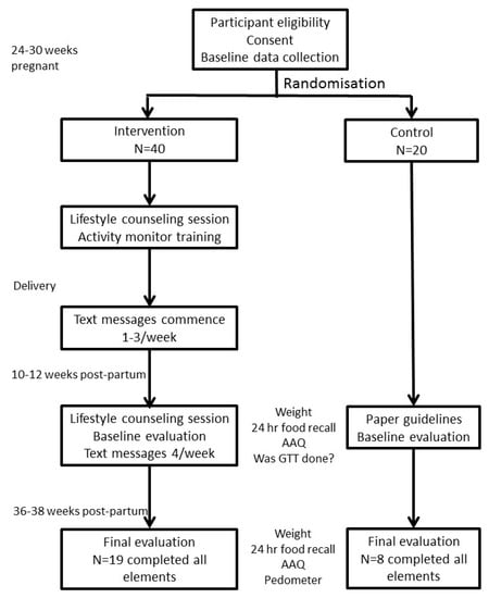 The study planned to recruit 60 women to be randomised in a 2:1 ratio to receive the digital health support program (40 participants) or to receive standard paper-based information only (20 participants). Randomisation was undertaken by computer random number generation, using a permuted block size of 4. Inclusion criteria were: GDM, as diagnosed by the 1998 Australasian Diabetes in Pregnancy Society Criteria [28] which required a fasting glucose level ≥5.5 mmol/L and/or a 2-h glucose level ≥8 mmol/L on a 75 g oral glucose tolerance test, age ≥18 years; owning a smart mobile phone with text messaging capability; having internet access; having sufficient skill in the English language to read text messages, and being physically capable of performing moderate intensity physical activity. Our tertiary level hospital cares for about 900 women with GDM per annum. All women in our health district who choose to be treated in a public hospital for free attend our clinics. In 2018, 83% of Australian adults owned a smart phone [29], and the vast majority of women attending our clinics own smart phones. Women meeting eligibility criteria were approached by the study coordinator when attending our dedicated Diabetes in Pregnancy antenatal clinic. Women attending this clinic were largely those who required insulin, as women not needing insulin were seen in regular antenatal clinics. Women were recruited whilst 24–30 weeks pregnant, in order to collect baseline data and to enable them to experience use of the activity monitor before they were more constrained by advanced pregnancy. The study protocol and consort diagram are outlined in Figure 1.