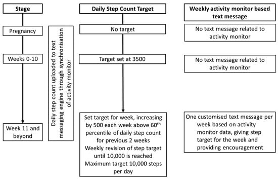 From weeks 6 post-partum an additional activity monitor related messages was sent. An automatic computerised algorithm utilised data uploaded from the activity monitors to generate this message, which gave adaptive step targets and feedback regarding their activity monitor activity.
