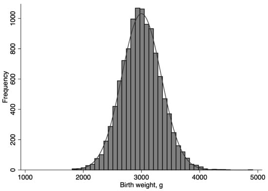 Neonates, whose birth weights were normally distributed (Figure 1), were grouped into NLBW (2500 g and above; n = 10,544) and LBW (<2500 g; n = 680) neonates. Both groups were further categorized into a narrower range of birth weights: among LBW neonates, <2000 g (n = 20) and 2000 to 2499 g (n = 660); among NLBW neonates, 2500 to 2999 g (n = 5001), 3000 to 3499 g (n = 4752), 3,500 to 3999 g (n = 757), and 4000 g and above (n = 34).