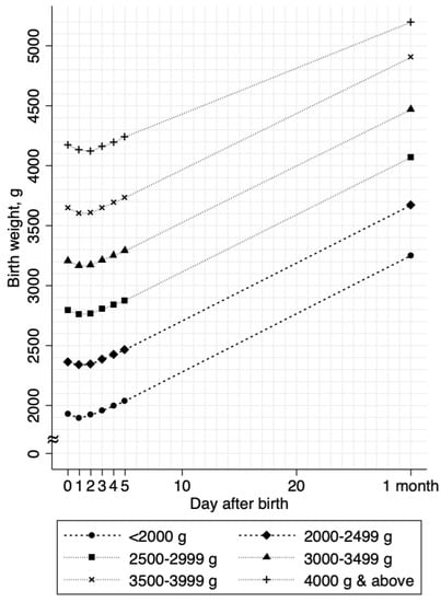 Body weight growth curves stratified by birth weights. The mean body weights are shown as connected lines stratified by birth weight categories. Values from day 0 through day 4 were estimated in 11,224 neonates; values at day 5 and 1 month (approximately 30 days of birth) were estimated in 10,336 neonates and 8071 neonates, respectively.