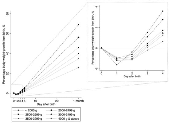 Daily percentages of bodyweight growth against birth weight. Each connected line shows the change in the percentage bodyweight growth from birth weight (([weight at every day − birth weight]/birth weight) × 100%), stratified by birth weight categories. Values from day 0 through day 4 were estimated in 11,224 neonates; values at day 5 and 1 month (approximately 30 days of birth) were estimated in 10,336 neonates and 8071 neonates, respectively.