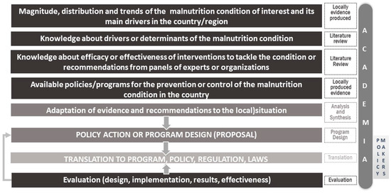 The design of sound policy to tackle malnutrition in all its forms requires that research institutions develop strategic research agendas to bridge knowledge gaps. The process to design evidence-based policies or programs applied to malnutrition begins with a study of the nutritional conditions and main drivers in the country/region, which is locally produced evidence (Figure 1).