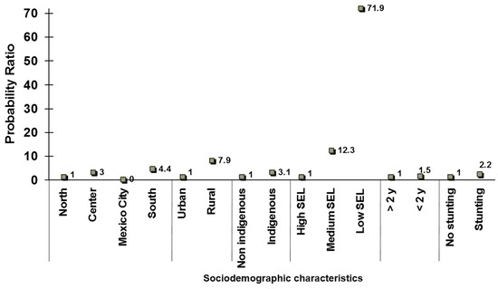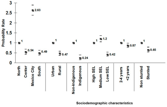 INSP conducted a simple comparison between the distribution of stunted children <5 years by different regional and socioeconomic categories versus the proportion of families who were beneficiaries of food-aid programs in each of the subgroups studied. This straightforward exercise concluded that the food programs in Mexico were not targeted to those most in need [20]. For example, Figure 3 shows the probability rate of participation in food programs in households with children <5 years of age in 1988 by geographic region, urban and rural areas, indigenous and non-indigenous population, socioeconomic status, age category, and nutritional status (stunting) of children within the households.