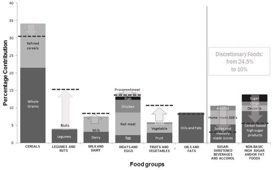 Dietary goals for Mexican adults involved substantially increasing the consumption of fruit and vegetables, more than double the consumption of beans and other legumes, and in a smaller proportion increasing the intake of milk and dairy products. On the other hand, consumption of SSBs, high energy-dense nutrient-poor foods, and alcohol should be greatly reduced from the current 24.5% of total energy to 10% or less. In addition, consumption of processed meat should also be minimized and to a lesser extent, red meat and refined cereals [36].