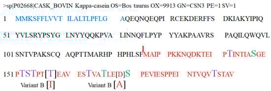 Approximately 11 genetic variants of κ-casein are known, of which two predominate in bovine milk, variants A and B; GMP variant B differs from variant A due to the substitution of a residue of isoleucine by a residue of threonine at position 136, and the substitution of a residue of alanine by an aspartic acid residue at position 148 (Figure 1) [6,8].