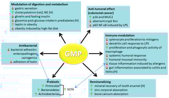 As the knowledge on structural characteristics and physicochemical properties of GMP advances, there is a growing interest in studying its usefulness in the food industry. GMP showed properties as a nutritional supplement, food additive, or as a functional food. In recent decades, different researchers devoted themselves to the study of GMP biological activities. Best described ones with a positive impact on human health are antibacterial, prebiotic, remineralizing, modulatory of digestion process and metabolism, anti-tumoral, and immune-modulatory activities (Figure 3). In this paper, we address a review of the results obtained both in vitro and in vivo that show that GMP can be used as a valuable component for the development of nutraceuticals or functional foods.