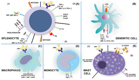 Effect of glycomacropeptide on immune cell function determined from in vitro assays. Glycomacropeptide (GMP) regulates the response of splenocytes, dendritic cells, macrophages, monocytes, and mast cells in different manners. So far, the receptor to GMP is unknown. (A) Splenocytes: (1) GMP modifies rodent splenocyte response to mitogens by inhibiting proliferative response and tumor necrosis factor (TNF)-α and interferon (IFN)-γ production, and by increasing immunoglobulin (Ig) A secretion. The inhibition on cellular proliferation is greater with proteolyzed GMP (GMPP) and is lost with asialylated GMP (aGMP). GMP has no effect on interleukin (IL)-12, IL-10, IgM, and IgG1 mitogen-stimulated release; (2) GMP stimulates the synthesis of soluble IL-1 receptor antagonist (IL-1ra) by splenocytes and suppresses the expression of the IL-2 receptor (IL-2R) on its cell membrane, when stimulated by mitogens; (3) in response to GMP, splenocytes secrete TNF-α and IL-10, and increase the expression of cyclooxygenase-2 (COX-2), inducible nitric oxide synthase (iNOS), and forkhead box P3 (Foxp3). GMP does not induce IL-2 and IFN-γ secretion. (B) Dendritic cells: GMP decreases IL-6, IL-1β, and TNF-α secretion induced by lipopolysaccharide (LPS) in murine bone-marrow-derived dendritic cells, without modifying IL-12 and IL-10 release. (C) Macrophages: GMP improves proliferation and phagocytic activity of human macrophages U937 when cultured at low calf fetal serum concentration. The effect is greater with GMPP and less with aGMP. (D) Monocytes: GMP triggers IL-8, IL-1β, and TNF-α release from THP-1 monocyte cells and human primary blood monocytes. (E) Mast cells: GMP does not stimulate histamine release from rat peritoneal mast cells, but inhibits its release when cells are activated by allergens through the IgE–high-affinity IgE receptor (FcεRI) complex. NE, no effect.