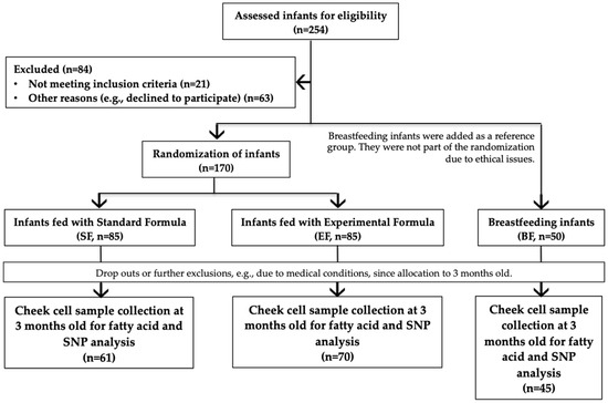 Even though there is wide evidence of the effect of FADS genetic variants in FA concentrations of different biological tissues, there is little evidence for infants during their first year of life [19,26,27,28], which is a critical period of early life programming in which LCPUFAs play an important role [29]. Studying this could identify vulnerable groups in the pediatric population and contribute to the refinement of current recommendations and legislations in regards to infant AA and DHA supplementation. Given the low rates of exclusive breastfeeding in Europe, and while efforts are still being made to promote it, it is important to secure an appropriate source of LCPUFAs for infants who are not breastfed to promote their development. Therefore, the aim of this study was to determine the effect of an infant formula supplemented with AA and DHA on fatty acid levels of three-month-old infants with different FADS genotypes.