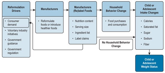 Although food manufacturers might reformulate foods for a number of different reasons, such as to reduce production costs or improve sensory characteristics, we focus here on reformulation to improve healthfulness. The effect of reformulation on child and adolescent obesity can occur even if households do not alter their food purchasing behavior; thus, it offers a different mechanism to affect childhood obesity and can complement efforts to change food choice behavior. Reformulation of foods to improve healthfulness can help remove the barriers to access to healthy foods for all populations, including rural, low-income, and ethnic and racial minority populations. Reformulation affects all consumers, not only those who are nutritionally aware []. Some governments began focusing on reformulation as one method to reduce childhood obesity. For example, the United Kingdom’s plan of action for childhood obesity released in 2016 calls for reductions in sugar, which should be accompanied by a reduction in calories, and the plan is conducted alongside work to achieve salt reduction targets []. Also, the Food and Drink Industry Ireland, under the oversight of the Food Safety Authority of Ireland, launched a national food reformulation program as part of an effort to tackle obesity [].