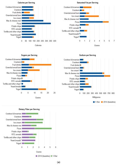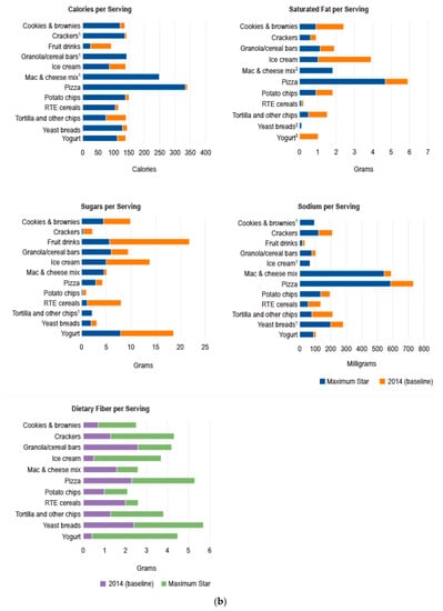 Figure 2a,b compare average nutrient levels in 2014 by product category with those of products that met Guiding Stars criteria for one star or for the maximum number of stars for the product category. No or few (i.e., fewer than five) products met the criteria for at least a one-star rating for frankfurters, fruit drinks, RTE macaroni and cheese, nut butters, and soft drinks, and were, therefore, excluded from the simulation analysis. In Figure 2a, blue bars represent the average one-star product values for calories, saturated fat, sugars, and sodium, and orange bars indicate the decrease in those values that would be required to shift the average values for products in 2014 to those of one-star products. For fiber, purple bars indicate the average values for products in 2014, and green bars represent the increase in fiber that would need to occur to shift to the average fiber values of one-star products. Figure 2b shows the corresponding changes to shift calorie and nutrient values to the average values for maximum-star products. For most products, the largest changes would need to occur for saturated fat, sugars, and fiber. Saturated fat would need to decrease substantially except for macaroni and cheese mix, RTE cereals, yogurt, and yeast breads. Sugars would need to decrease substantially for all products except tortilla and other chips and macaroni and cheese mix. Dietary fiber would need to increase for all products except yeast breads. The average calorie levels are not substantially different except for fruit drinks and ice cream for one-star levels, and for these products and tortilla and other chips for maximum-star products. Required changes for sodium levels are important for some products, such as pizza, macaroni and cheese mix, and potato chips, but are relatively small for most other products. For each nutrient, at least one or two product categories had lower average values for products in 2014 than those of one-star or maximum-star products; however, there was no general pattern for these cases.