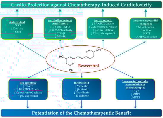 Since resveratrol has been shown to possess both cardio-protective and anticancer properties (Figure 1), leveraging these properties in cardio-oncology seems very promising. Indeed, a considerable amount of preclinical literature demonstrates that resveratrol protects against the cardiovascular adverse effects of a number of cancer treatments. Similarly, a plethora of in vitro and in vivo studies demonstrate that resveratrol enhances the anticancer effects of these treatments. Therefore, the objective of this review is to summarize and critically evaluate the contemporary knowledge that describes the effects of resveratrol when combined with cancer treatments on the cardiovascular system as well as on the tumor/cancer cells, in a cardio-oncology perspective. We will first discuss the interaction of resveratrol with anthracyclines, since this group of chemotherapeutic agents is considered to be the most cardiotoxic. Thereafter, we will discuss the existent knowledge about the effect of resveratrol on cardiovascular toxicity and chemotherapeutic efficacy of other cancer treatments that are known to be cardiotoxic. Moreover, we will discuss the potential cardio-protective and anticancer effects of the most common resveratrol analogs. To conclude, we will highlight significant gaps in knowledge and discuss important future research directions in order to translate this preclinical knowledge to benefit cardio-oncology patients.