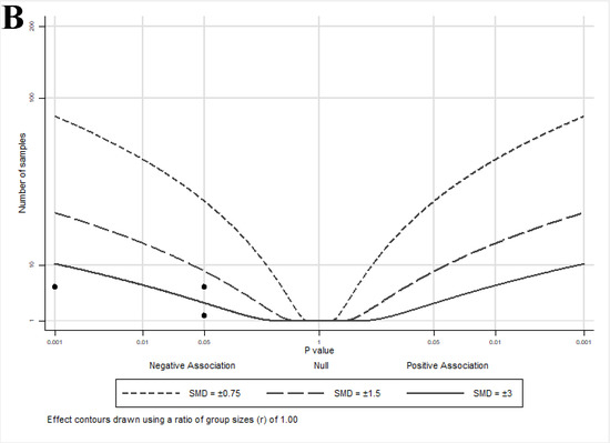 An albatross plot summarizing the effects of lycopene on cell growth is presented in Figure 3A. The overall SMD of −2 (range: −0.6–<−2) indicates a reduction in cell growth by lycopene exposure. Two studies [33,36] showed reduced growth with smaller effect estimates (SMDs between −0.5 and −1), two studies [40,43] showed SMDs between −1 and −2, and three studies [32,41,42] showed an SMD < −2.