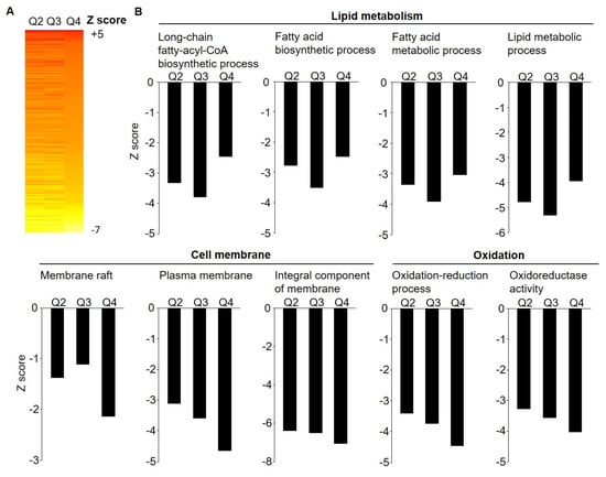 Effect of weight loss on SAT gene expression pathway enrichment (n = 138). Parametric analysis of gene-set enrichment (PAGE) were performed on microarray data including 681 significantly (p < 0.05) regulated genes across weight loss quartiles. (A) Heat map on biological pathways that were significantly differentially regulated by weight loss, based on the Z score for difference between weight loss quartiles with Q1 (lowest quartile) as a reference. (B) Biological pathways involved in lipid metabolism, cell membrane, and oxidation processes were significantly downregulated with weight loss. Further list of pathways see Table S2.