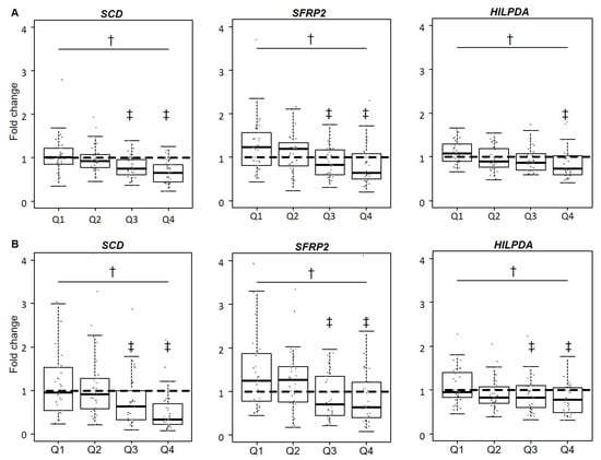 Effect of weight loss on SAT mRNA gene expression (microarray and RT-qPCR) of stearoyl-CoA desaturase (SCD), secreted frizzled-related protein 2 (SFRP2), and hypoxia inducible lipid droplet-associated protein (HILPDA). (A) Relative gene expression across weight loss quartiles (Q1: lowest quartile) determined by microarray (n = 138) is expressed as fold change (FC) between baseline (T0) and after 12 weeks (T1) (FC = 2(logT1−logT0)). (B) Expression profiles quantified by RT-qPCR (n = 136) are presented as FC of the delta-delta CT method (2−ΔΔCT). Data points with an FC > 4.2 are not plotted (SCD: n = 2, SFRP2: n = 1). Significant differences (p < 0.05) are depicted by † for overall effects and ‡ for pairwise comparisons.