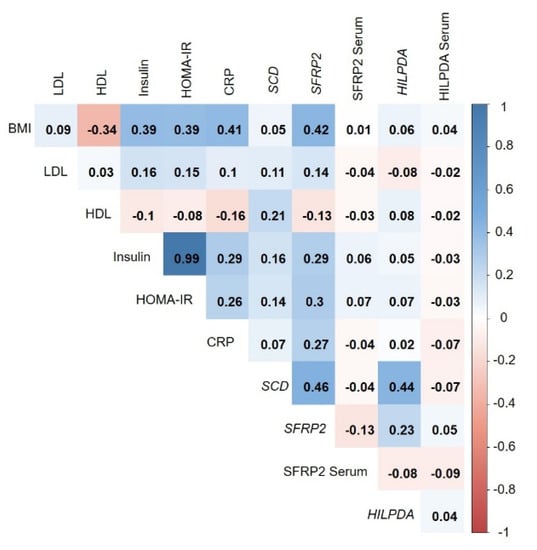 Cross-sectional correlations (at Week 12) between SCD, SFRP2, and HILPDA microarray gene expression levels, serum levels of SFRP2 and HILPDA, BMI, and metabolic biomarkers (LDL, HDL, insulin, HOMA-IR, CRP). Data are shown as Spearman coefficients adjusted for age and sex. The cross-sectional correlations for baseline data and for log relative changes between baseline and Week 12 are shown in Figure S2.