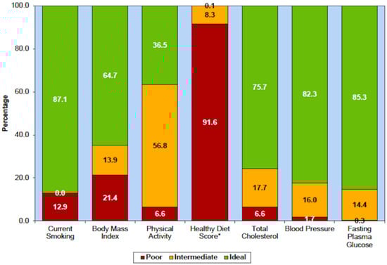 Diet is the worst of the risk issues in the USA. Prevalence (unadjusted) estimates for poor, intermediate and ideal cardiovascular health for each of the seven metrics of cardiovascular health in the American Heart Association 2020 goals, US children aged 12–19 years, National Health and Nutrition Examination Survey (NHANES) 2011–2012. * Healthy diet score data reflect 2009–2010 NHANES data. (Reproduced by permission of Wolters Kluwer from: Mozaffarian D, Benjamin EJ, Go AS, Arnett DK, Blaha MJ, Cushman M, et al. Heart disease and stroke statistics—2015 update: A report from the American Heart Association. Circulation. 2015;131(4): e29–322.).
