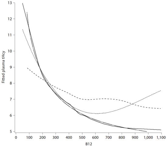 Polynomial and inverse regression, spline, loess fits for plasma tHcy with B 12. Solid, dotted, long dashed and short dashed lines represent loess, cubic polynomials, cubic polynomials of the inverse covariate and smooth splines, respectively. (Reproduced by permission of Karger from [44]).