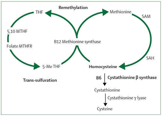 Homocysteine metabolism. B12 = cobalamin. B6 = pyridoxine. MTH = methylenetetrahydrofolate. MTHFR = methylenetetrahydrofolate reductase. SAM = S-adenosylmethionine. SAH = S-adenosylhomocysteine. 5-Me THF = 5-methyl tetrahydrofolate.