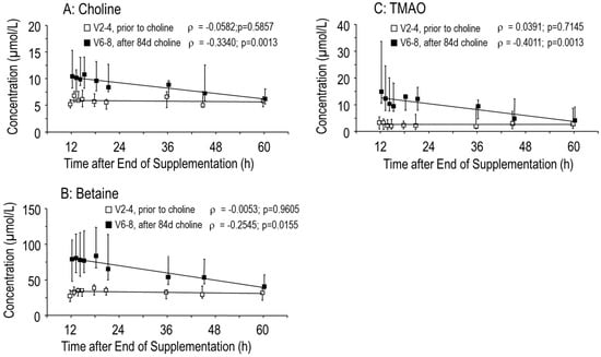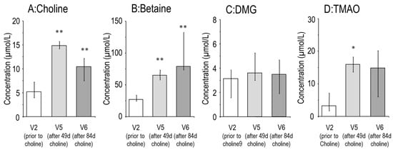 3.1. Effects of Choline Supplementation on Plasma Choline and Its Water-Soluble Metabolites