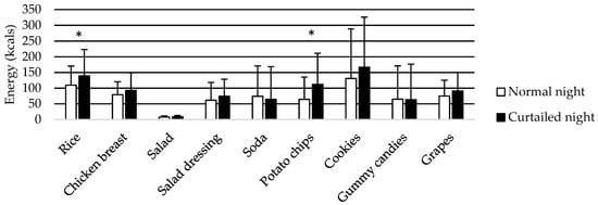 Means and standard deviations of selected portion sizes of meals and snacks after the normal night and curtailed night. The amount of energy selected from rice and potato chips was significantly higher after the curtailed night. * p < 0.05.