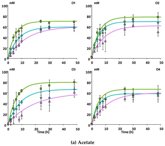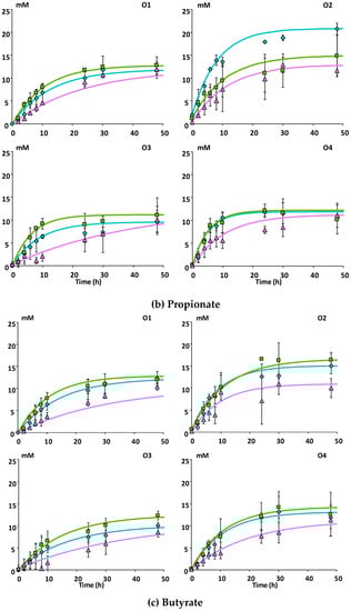 Kinetics of production of short chain fatty acids during in vitro fermentation of the apple matrices with fecal microbiota (n = 3) from four healthy subjects. Experimental and modelled data for acetate (a) propionate (b) and butyrate production (c). Each point represents the mean concentrations of SCFAs expressed in mM. Bars represent the standard error of the mean (n = 3). O1 to O4: subject 1 to 4.