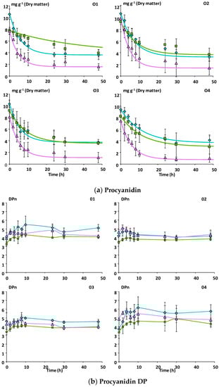 Kinetics of degradation of procyanidins during in vitro fermentation of the apple matrices with fecal microbiota (n = 3) from four healthy subjects. (a) Experimental and modelled data for procyanidin degradation. (b) Average degree of polymerization of procyanidins. Error bars represent the standard error of the mean (n = 3). O1 to O4: subject 1 to 4.