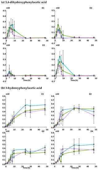 Within the phenylacetic acid derivatives, 3,4-dihydroxyphenylacetic acid was an intermediate product whose concentration reached a peak between 4 and 6 h of fermentation and then decreased rapidly with Mno while more gradually with the two other matrices (Figure 4a). 3-hydroxyphenylacetic acid, increased and reached a plateau after 10 to 24 h of fermentation with no further degradation (Figure 4b). Significant differences among the three matrices (Mnc > Mcov > Mno; p ≤ 0.05) and the four subjects (O4 > O1 > O2 > O3; p ≤ 0.001) were observed for the intermediate metabolite i.e., 3,4-dihydroxyphenylacetic acid, but not for the end-product i.e., 3-hydroxyphenylacetic acid.