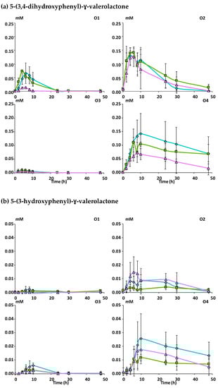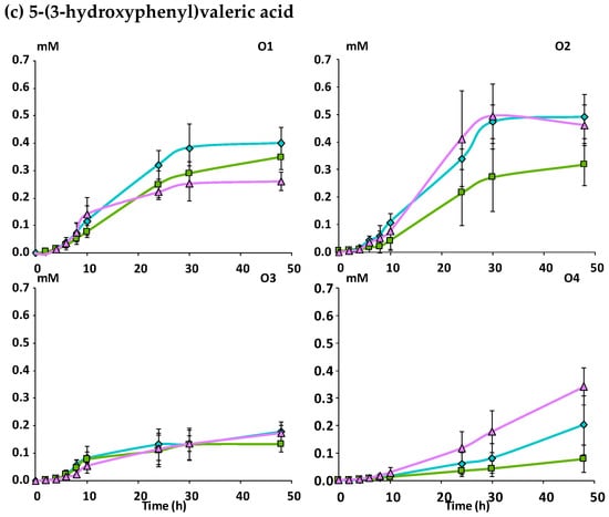 Among the remaining identified phenolic metabolites, 5-(3,4-dihydroxyphenyl)-ɣ-valerolactone increased and reached a maximum level after 6 hours of fermentation for subjects O1, O2 and O3, and 10 h for O4, and then decreased slowly (Figure 5a). Its maximal concentration showed a large inter-individual variation (p ≤ 0.001) (Table 3), subjects O2 and O4 being the largest producers followed by O1 and O3. Dehydroxylation of 5-(3,4-dihydroxyphenyl)-ɣ-valerolactone led to the formation of 5-(3-hydroxyphenyl)-ɣ-valerolactone within 6 to 10 hours of fermentation depending on the subject to finally decline slowly (Figure 5b). Like for its precursor, large inter-individual variations were observed (p ≤ 0.001, Table 3), subject O4 being the largest producer. Finally, 5-(3-hydroxyphenyl)valeric acid was produced at higher concentrations than the previous transitory metabolites and accumulated in the medium after 30 h of fermentation (Figure 5c). A lower production (p ≤ 0.01) of this end-product was observed for Mcov despite a large inter-individual variation, subject O2 being the largest producer and O3 the smallest (Table 3).