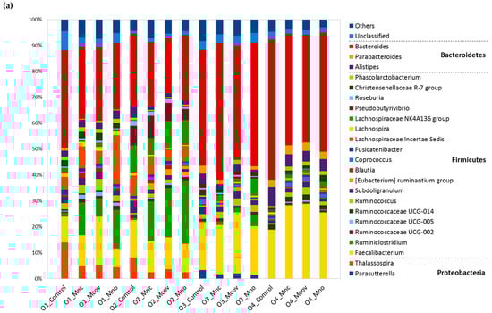 On the 47 remaining samples, a total of 310 OTUs was obtained (Table S2). When looking at the initial microbiota composition at the genus level (Control T0), all subjects harbored a very high relative abundance of Bacteroides (28 to 54%), Faecalibacterium (10 to 19%) belonging to the Bacteroidetes and Firmicutes phylum, respectively (Figure 6a). Other bacterial groups or genera were also relatively abundant (0.1 to 10% depending on subjects) in the Firmicutes (Ruminiclostridium, Ruminococcaceae_UCG-002, Ruminococcus, Subdoligranulum, Blautia, Coprococcus, Fusicatenibacter, Lachnospira, Lachnospiraceae_NK4A136_group, Roseburia, Christensenellaceae_R-7_group) and the Bacteroidetes (Alistipes). Some bacterial groups or genera were either absent or at high levels (>3%) depending on subjects, like Pseudobutyrivibrio (Firmicutes) Parabacteroides (Bacteroidetes) or Thalassospira and Parasuterella (Proteobacteria).