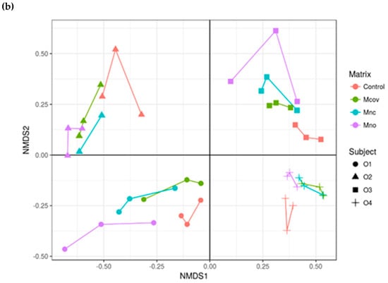 In consequence, in order to investigate both the matrix effect and the procyanidin-cell wall linkage effect on the bacterial community composition, the analyses were performed at the initial (Control T0) and final (T48 h) time points of batch incubation of the fecal microbiota with the apple matrices (Mcov, Mnc, Mno). In total, 48 samples were analyzed by bacterial 16S metabarcoding (4 subjects × 3 feces × 4 conditions i.e., Control-T0, Mcov-T48, Mnc-T48, Mno-T48) (Figure S1). One sample from subject O2 (Mnc-T48) was discarded because less than 1000 sequences were obtained for this sample.