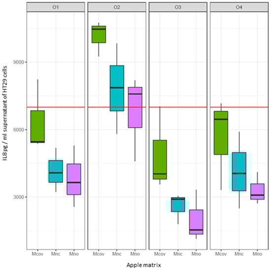 Mno). Interleukin 8 (IL8) was used as a marker of inflammation. The red line corresponds to IL8 production by TNFα-treated intestinal cells. The box plots represent IL8 production (pg/mL) by TNFα treated cells on which the supernatant of the fermenters after 48h fermentation of the apple matrices has been applied. Centre lines show the medians; box limits indicate the 25th and 75th percentiles. When IL8 levels > red line: pro-inflammatory effect of the supernatants. When IL8 levels < red line: anti-inflammatory effect of the supernatants.