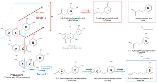 Proposed pathways for procyanidin catabolism by the human gut microbiota (adapted from Appeldoorn et al., 2009 [] and Duenas et al., 2015 []). Route 1 in red and Route 2 in blue correspond to the hydrolysis pathways of the upper and lower units of procyanidins, respectively. The additional route in grey could have contributed to the formation of other detected metabolites. Metabolites in frames were the ones that reached a plateau after 48h fermentation (end-products). The other ones were transitory metabolites. Flavonols (<2% w/w of apple matrices) were added in the figure because they may contribute to the formation of hydroxyphenylacetic acid metabolites according to Del Rio et al. 2013 [].