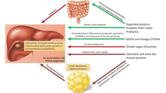 The effects of diverse macronutrients on non-alcoholic fatty liver disease pathophysiology. An unhealthy dietary pattern including saturated fats, trans fats, simple sugars and animal protein (red and processed meat) results in an increased total and visceral fat mass, insulin resistance, increased hepatic de novo lipogenesis and gut dysbiosis. Under these conditions and acting parallel, fat accumulates in the liver causing lipotoxicity, increased oxidative stress and mitochondrial dysfunction adding genetic or environmental predisposition for hepatic lipid accumulation (‘multiple hit hypothesis´). Red arrow: unfavorable/harmful effect; Green arrow: favorable/beneficial effect. NAFLD: non-alcoholic fatty liver disease; PPAR: peroxisome proliferator-activated receptors.
