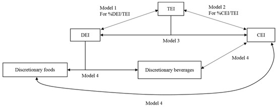 A visual representation of the relationships between various dietary components and the modelling strategies that were studied is presented in Figure 1. Four multi-equation models were estimated: equations of TEI and proportion of TEI from DEI (%DEI/TEI) (Model 1), equations of TEI and proportion of TEI from CEI (%CEI/TEI) (Model 2), equations of DEI and CEI (Model 3), and equations of discretionary foods, discretionary beverages, and CEI (Model 4).