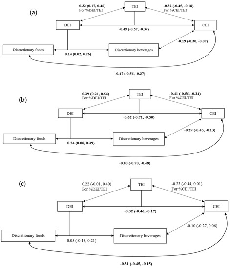 Diagrammatic representations of the correlations among TEI, CEI, DEI, discretionary foods and beverages in: (a) the combined participant sample; (b) participants without obesity; and (c) participants with obesity. Results are presented as cross-equation correlation ρ (95% CI). Models were adjusted for sex (male or female), age (<35 years, 35–64 years, or ≥65 years), education (completed post high school education or not), BMI category (has or does not have obesity), day of the week dietary intake was reported (weekend or weekday) and socioeconomic status (SEIFA top quintile or below). Correlations written in bold face are significant at the 5% level. TEI, total energy intake; DEI, discretionary energy intake; CEI, core energy intake.