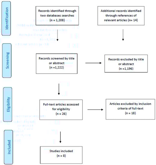 The systematized search identified 1222 articles, of which eight studies were found to meet the inclusion criteria to be considered in the review (Table S2).