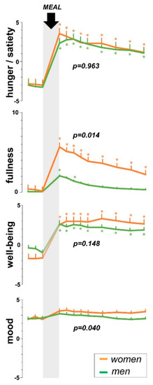 - Bedard, A.; Hudon, A.M.; Drapeau, V.; Corneau, L.; Dodin, S.; Lemieux, S. Gender Differences in the Appetite Response to a Satiating Diet. J. Obes. 2015, 2015, 140139. [Google Scholar] [CrossRef] [PubMed]