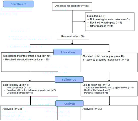From the initial total sample of 80 children randomly allocated to the two study groups, 15 children (5 from the IG and 10 from the CG) could not be re-examined at follow-up. Figure 1 provides the flow diagram of the study according to the CONSORT guidelines.