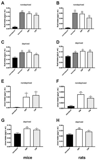 Episodic 2-h consumption of individually presented (acceptance) cornstarch, sucrose, GM, and CM isocaloric solutions (A–D), and of standard, GM- and CM-enriched chow (E–H) in sated (nondeprived) and energy-deprived mice (left panel) and rats (right panel).*, p ≤ 0.05; **, p ≤ 0.01; ***, p ≤ 0.001.
