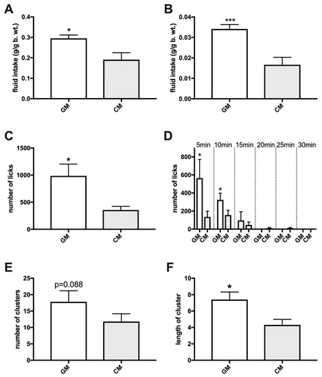 Episodic consumption of simultaneously presented GM and CM over 2-h in sated mice (A) and rats (B), lickometer activity during a 30-min exposure ((C): 0–30 min; (D): 5-min intervals), the number of GM over CM licking bouts (cluster number) (E), and the cluster length(s) of each GM and CM bout (F) in sated rats. *, p ≤ 0.05; ***, p ≤ 0.001.