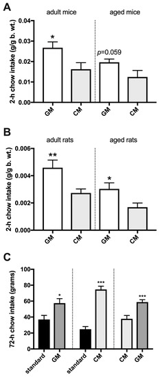 Consumption of simultaneously presented GM- and CM-enriched chow in adult and aged sated mice (A) and rats (B) over 2 h and simultaneously presented pellets (standard vs. GM; standard vs. CM, and GM vs. CM) over 72 h in adult rats (C).*, p ≤ 0.05; **, p ≤ 0.01; ***, p ≤ 0.001.