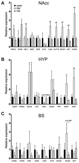 Relative expression of feeding-related genes in the nucleus accumbens (A), hypothalamus (B), and brain stem (C) of mice maintained for 24 h on GM or CM. Water served as a baseline tastant. a—significantly different from the water group; b—significantly different from the CM group. Analysis performed with ANOVA followed by Bonferroni’s test and corrected for multiple comparisons.