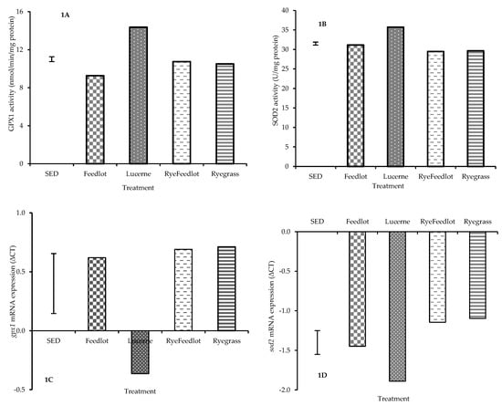 It has been well established from biological, biochemical and behavioural studies that the consumption of diets high in omega-3 fatty acids has many health advantages such as reducing the risk of heart disease, inflammation, obesity, cancer, hypertension, depression and asthma [,]. These effects can be mediated through autoimmune functions, pathological responses, insulin-stimulated energy disposal, gene expressed signal transduction, eicosanoid metabolism. If omega-3 fatty acids are beneficial in improving the health and wellbeing of humans and animals, it could possibly be through amelioration of oxidative stress, immune suppression and cell damage enhanced by the antioxidant defence. In this case, there should be associative effects between activity and/or relative mRNA expressions of antioxidant enzymes and diet-induced changes in muscle essential n-3 fatty acids, for example, ALA. Feeding alfalfa (lucerne) forage or supplemental flaxseed to sheep increased muscle essential n-3 fatty acid concentration, mainly ALA, in sheep [,]. Therefore, the hypothesis to be tested in the present experiment is that if there was a significant increase in muscle ALA concentration with dietary intervention, it should alter the activity and(or) relative mRNA expression of antioxidant enzymes through cellular biochemical mechanisms and signal transductions. To test this, we used feedlot diets that generally provide high proportions of LA so that muscle n-6 levels will be increased significantly to compare with a pasture diet such as lucerne (alfalfa) that may enrich muscle n-3 levels, providing an extreme range of fatty acids for comparisons.