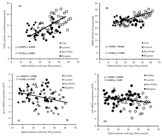 Relationship between muscle glutathione peroxidase 1 (GPX1) (A) or superoxide dismutase 2 (SOD2) (B) enzyme activity and alpha linolenic acid (ALA) concentration. Muscle GPX1 (r2 = 0.319, p = 0.002; Figure 2A) and SOD2 (r2 = 0.244, p = 0.009; Figure 2B) enzyme activities were linearly related to ALA (C18:3n-3). In Figure 2A,B, F.lot = Feedlot and Rye+Pellet = RyeFeedlot. Relationship between muscle gpx1 (C) or sod2 (D) mRNA expression (Delta CT) and ALA. A positive (r2 = 0.102, p = 0.017, Figure 2C) linear relationship of mRNA expressions of gpx1 with ALA was observed whereas the mRNA expressions of sod2 tended (r2 = 0.049, p = 0.09, Figure 2D) to be related to ALA concentration. In Figure 2C,D, Rye+Pellet = RyeFeedlot. In Figure 2A–D, each point represents an individual animal.