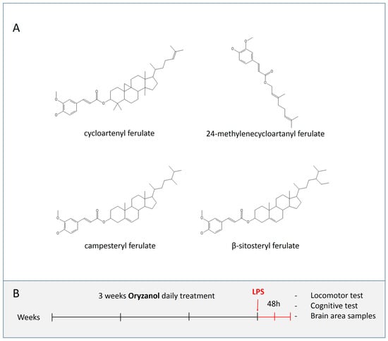 Chemical structures of different organic molecules contained in γ-oryzanol (A). Graphic scheme of γ-oryzanol and lipopolysaccharide (LPS) treatment protocol (B).