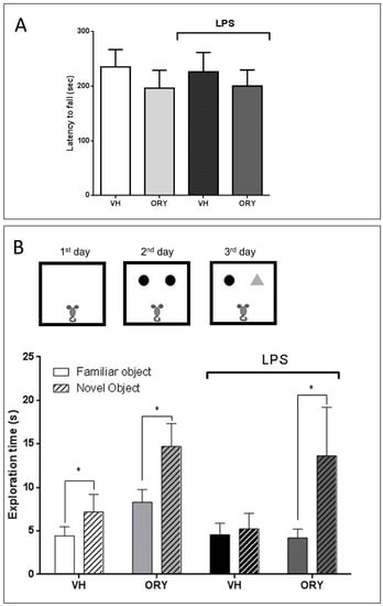 Since LPS induces acute and widespread inflammation accompanied by an outbreak of pro-inflammatory mediators, prior to the cognitive test, mobility performance was evaluated by using the rotarod test (Figure 2A). Motor activity was comparable between the two groups, showing no differences in term of latency to fall (Ftreatment (3, 33) = 0.24, p = 0.87). In addition, LPS did not affect mobility in the ORY group or in the VH group.
