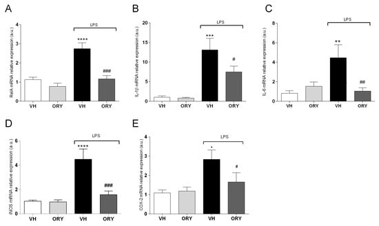 Graphic representation of quantitative RT-PCR data obtained from RNA extracted from the hippocampi of VH, ORY, LPS, and ORY+LPS mice. Data are expressed as the fold change of the target gene (RelA in (A), IL-1β in (B), IL-6 in (C), iNOS in (D) and COX-2 in (E)) normalized to the internal standard control gene (β-Actin). Data are shown as the mean ± S.E.M. One-way ANOVA tests with Newman–Keuls post-test were used to determine statistical significance, * p < 0.05, ** p < 0.005, *** p < 0.0005 and **** p < 0.0001 vs. VH, # p < 0.05, ## p < 0.005 and ### p < 0.0005 vs. LPS. VH: vehicle; ORY: γ-oryzanol; LPS: lipopolysaccharide.