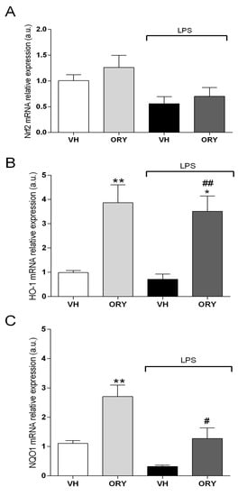 It is well known that the Nrf2-ARE phase II enzymes play a key role in the antioxidant and anti- inflammatory response []. In establishing the effects of ORY on this pathway, the mRNA expressions of Nrf2, HO-1, and NQO1 were evaluated (Figure 4). Nrf2 mRNA expression did not significantly change among the different experimental groups (Ftreatment (3, 33) = 3.23, p = 0.305). On the other hand, chronic ORY treatment notably increased HO-1 (Ftreatment (3, 33) = 9.34, p < 0.005) and NQO1 (Ftreatment (3, 33) = 11.92, p < 0.0001) gene expression compared to VH. Interestingly, ORY was able to induce the gene expression of Phase II antioxidant enzymes, even after pro-inflammatory stimulation, although the magnitude of the increase was lower respect to ORY alone. Indeed, HO-1 and NQO1 mRNA expression was statistically higher in ORY-treated mice challenged with LPS compared with animals from the reference group (VH plus LPS) (HO-1: p < 0.005; NQO1: p < 0.05).