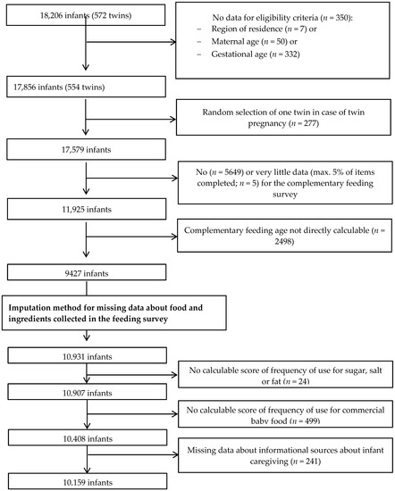 Of the 18,258 initially included infants, 17,856 were eligible (Figure 1). We randomly selected one twin in the case of twin birth (n = 277) to avoid family clusters. We then excluded infants with little or no information (n = 5654) regarding CF and then those without calculable age at CFI after the imputation of missing data (n = 994), leading to a maximal sample of 10,931 infants. The SUs of sugar, salt, and fat were calculable for 10,907 infants. Missing data in variables included in the multivariable models led to a final analyzed sample of 10,159 infants.