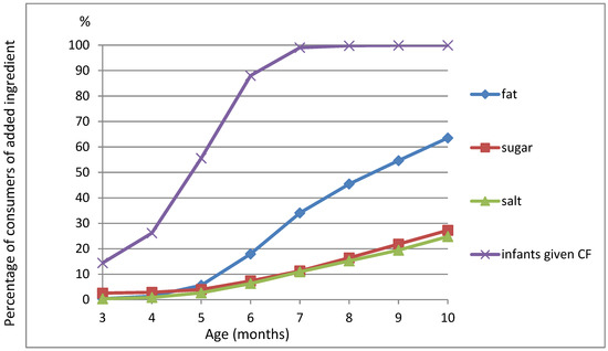 Monthly consumption of added sugar, salt, and fat from three to 10 months old (n = 10,907); the percentages are calculated with the weighted data. To be a consumer of one given ingredient is defined as when the use value of the ingredient is at least “sometimes” in the considered month, i.e., for the 1 (sometimes), 2 (often), or 3 (always or almost always) value in the complementary feeding (CF) questionnaire. The upper line (infants given CF) represents the percentage of infants who received complementary foods at the considered age.